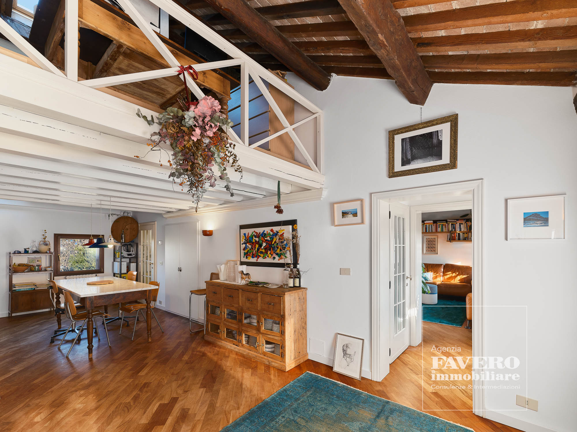 L'abitazione ha una ampia superficie (in gran parte utilizzata dalla zona giorno in questa versione della casa) ma vista l'importante altezza dei locali è stato possibile anche creare un piano ammezzato (in parte a soppalco sulla zona giorno) per ampliare ulteriormente lo spazio e questo ha avuoto l'effetto di enfatizzare lo charme di questa residenza. La superficie calpestabile, nel totale tra piano secondo e piano ammezzato, è di quasi 180mq!