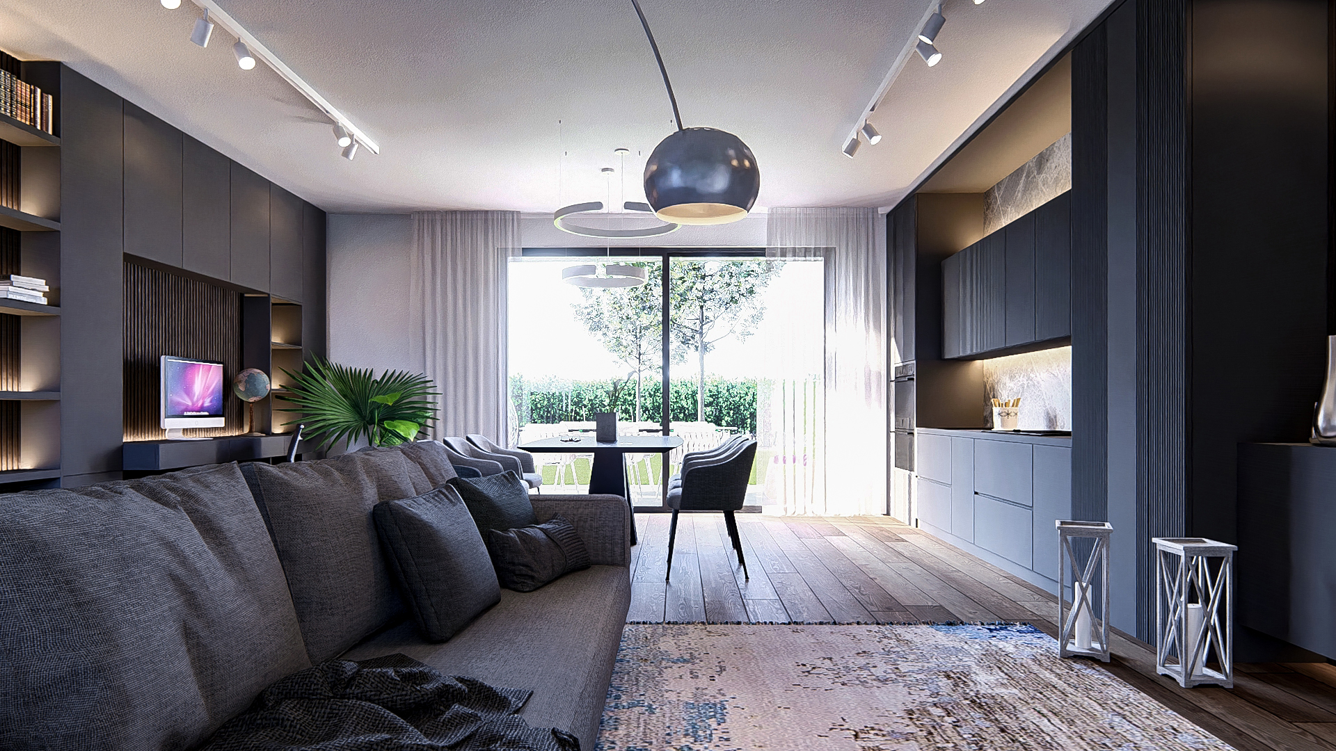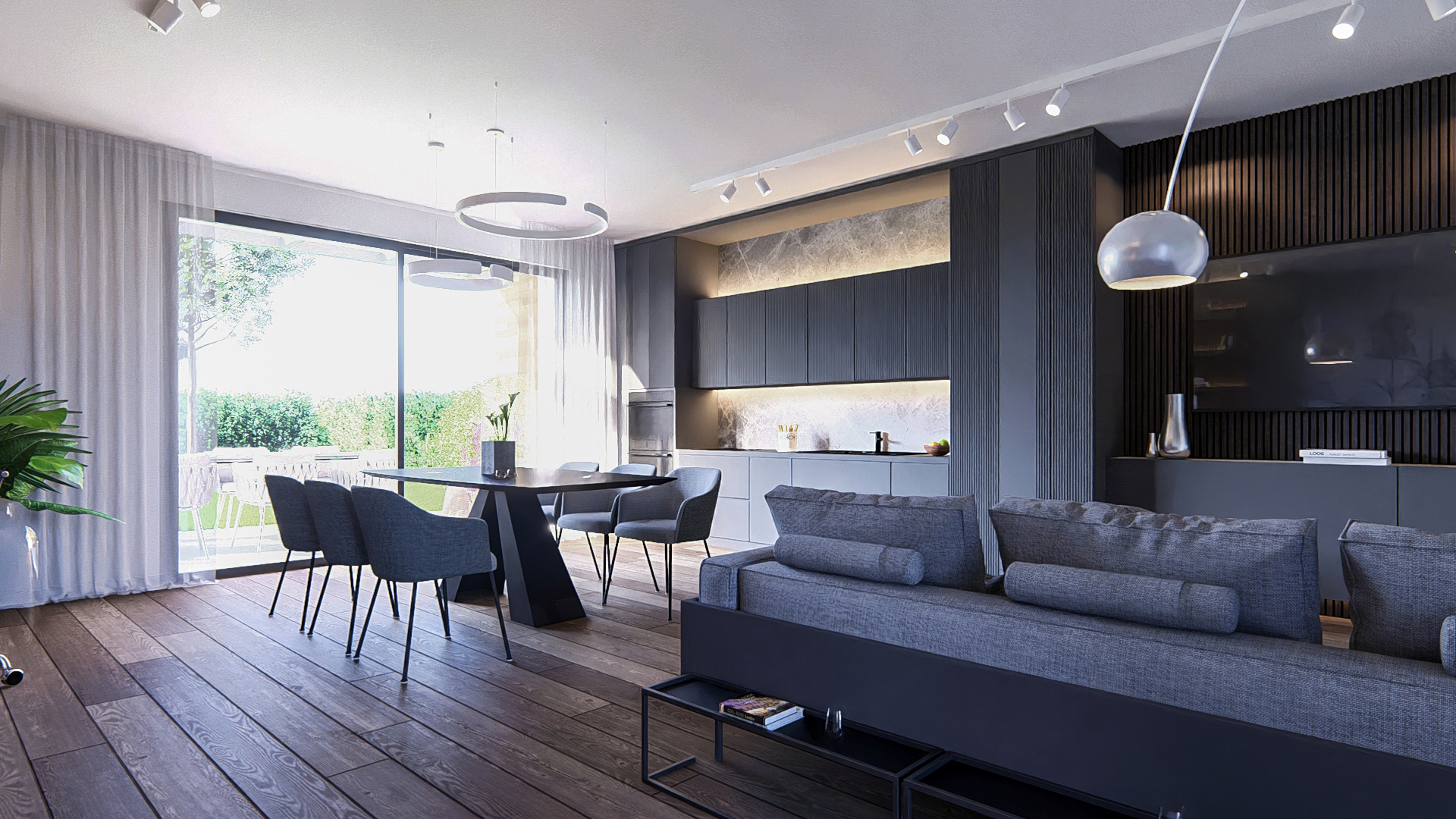 Composto da una zona living di 52mq con due grandi vetrate a sud e a nord, 2 terrazze grandi, 3 camere da letto (matrimoniale, doppia e singola), 2 bagni e ben 200mq di giardino privato con accesso diretto dal soggiorno (da scala privata).